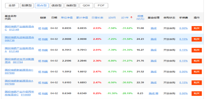 数据显示,近一年,截至4月3日,数据可取得的71只主动权益类产品中,64只基金收益率告负,占比超九成,6只产品收益率更已跌超30%。其中,国投瑞银“名将”施成在管产品跌幅居前,国投瑞银先进制造混合、国投瑞银产业趋势混合A/C、国投瑞银进宝灵活配置混合等多只施成在管产品跌幅超过35%。