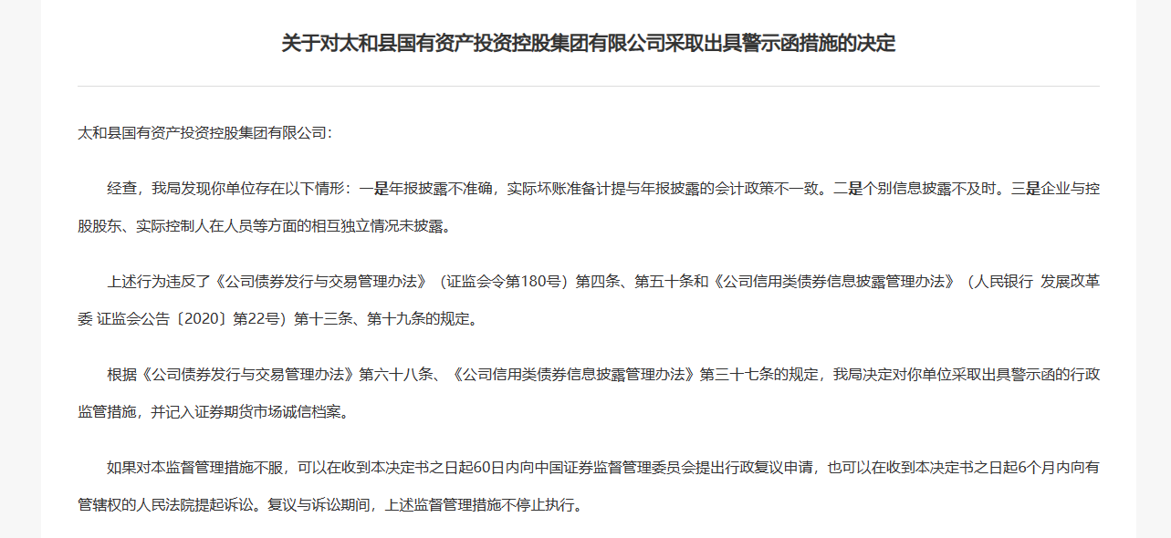 据安徽证监局官网消息,太和县国有资产投资控股集团有限公司被警示。经查,安徽证监局发现太和国投集团存在以下情形:一是年报披露不准确,实际坏账准备计提与年报披露的会计政策不一致;二是个别信息披露不及时;三是企业与控股股东、实际控制人在人员等方面的相互独立情况未披露。上述行为违反了《公司债券发行与交易管理办法》(证监会令第180号)第四条、第五十条和《公司信用类债券信息披露管理办法》(人民银行 发展改革委 证监会公告〔2020〕第22号)第十三条、第十九条的规定。根据《公司债券发行与交易管理办法》第六十八条、《公司信用类债券信息披露管理办法》第三十七条的规定,安徽证监局决定对其采取出具警示函的行政监管措施,并记入证券期货市场诚信档案。