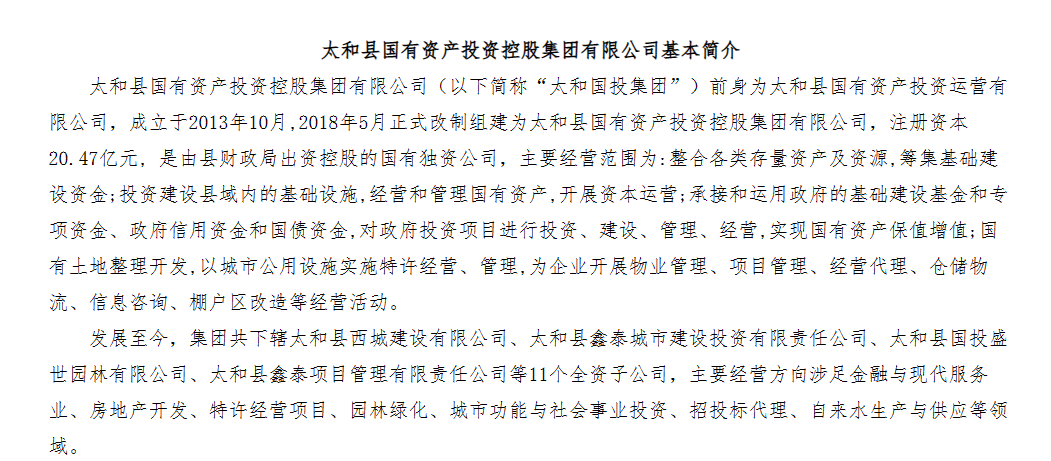 据太和国投集团官网显示,公司前身为太和县国有资产投资运营有限公司,成立于2013年10月,2018年5月正式改制组建为太和县国有资产投资控股集团有限公司,注册资本20.47亿元, 是由县财政局出资控股的国有独资公司。主要经营范围为:整合各类存量资产及资源,筹集基础建设资金;投资建设县域内的基础设施,经营和管理国有资产,开展资本运营等。