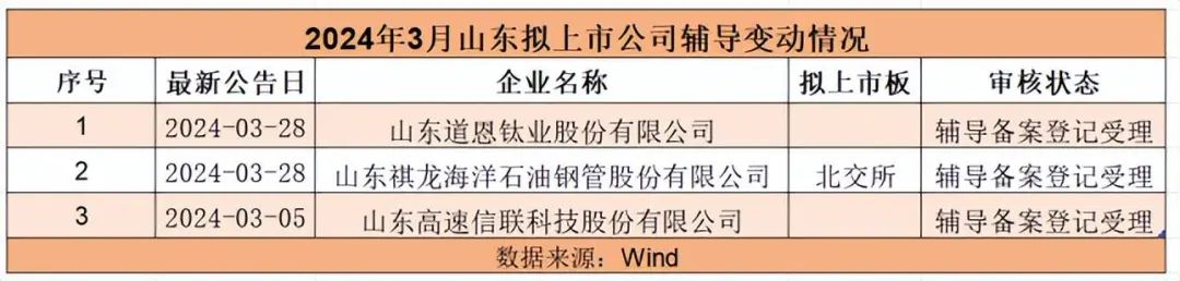 3月,山东新增3家辅导备案企业。证监会公开发行辅导公示系统显示,3月5日,山东高速信联科技股份有限公司(下称“信联科技”)辅导备案;3月28日,山东祺龙海洋石油钢管股份有限公司(下称“祺龙海洋”)辅导备案;同日,山东道恩钛业股份有限公司(下称“道恩钛业”)也进行了辅导备案。