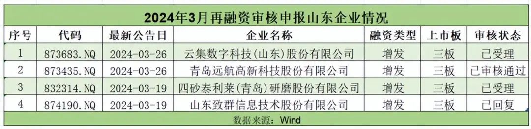 据Wind统计,3月,山东有4家企业更新再融资审核状态。四砂研磨(832314.NQ)增发和云集数科(873683.NQ)增发的审核状态均为已受理,致群股份(874190.NQ)增发审核状态为已回复,远航高新(873435.NQ)增发为已审核通过。
