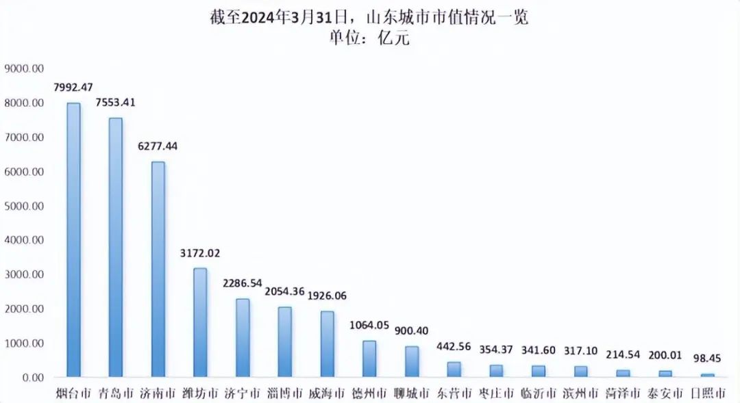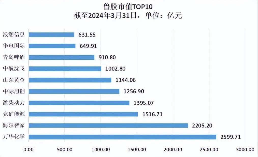 截至3月31日,山东市值排名前十的上市公司总市值为13312.70亿元,总市值过千亿的有7家。