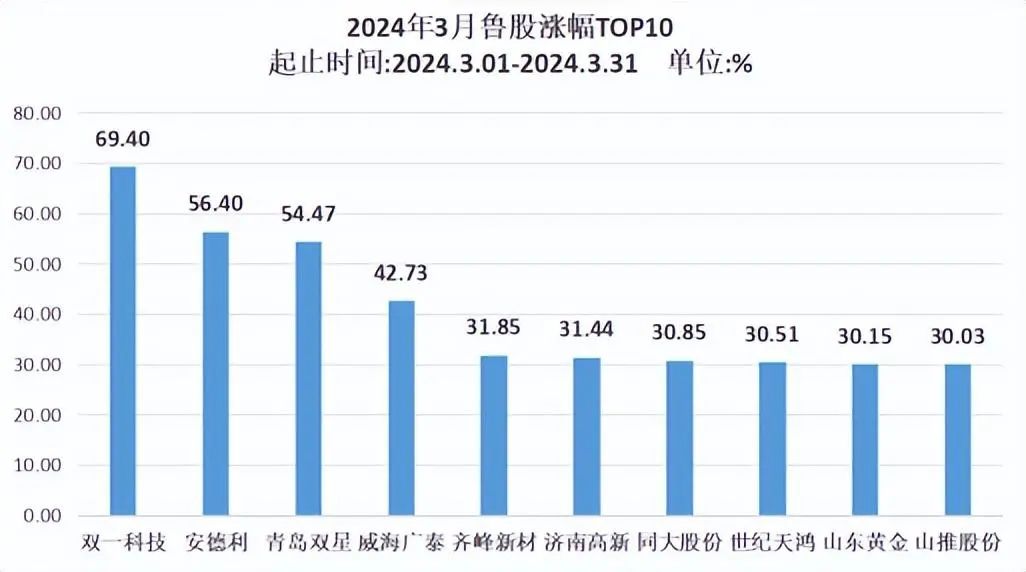 3月,鲁股月度区间涨幅最大的是双一科技(300690.SZ),涨幅为69.40%;紧随其后的是安德利(605198.SH),区间涨幅为56.40%;此外,青岛双星(000599.SZ)、威海广泰(002111.SZ)涨幅也超过40%。