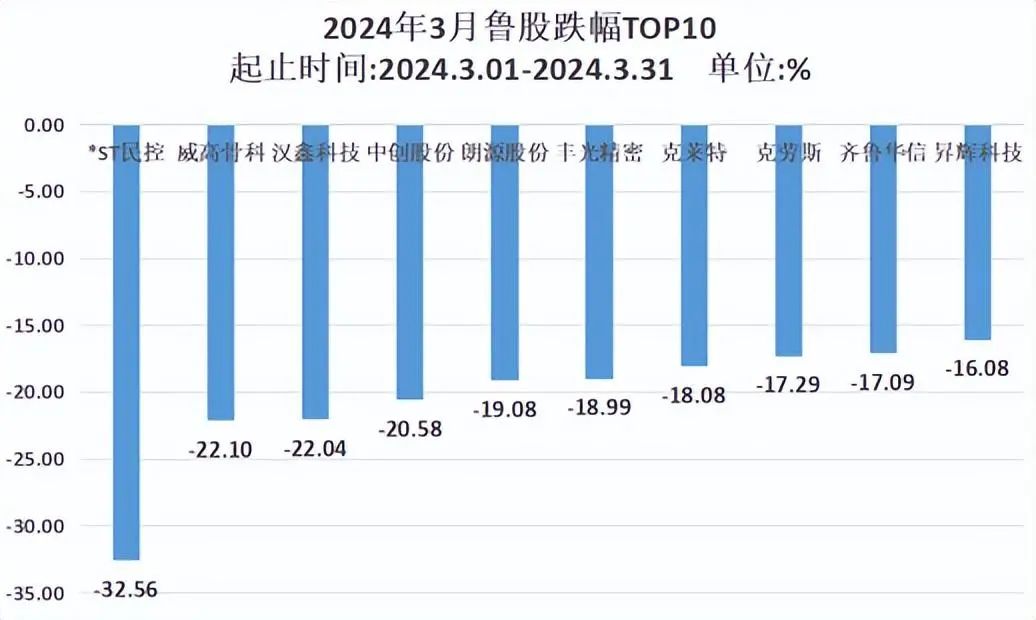 3月跌幅最大的是*ST民控(000416.SZ),月度区间跌幅为32.56%,威高骨科(688161.SH)、汉鑫科技(837092.BJ)和中创股份(688695.SH)跌幅也均超过20%。