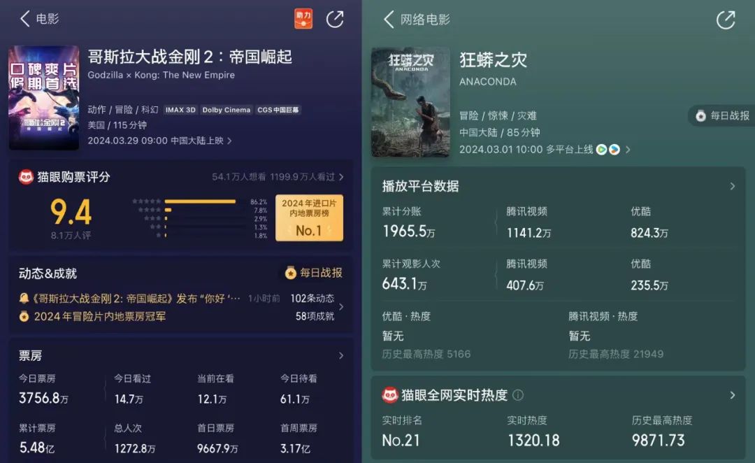 正在热映中的《哥斯拉大战金刚2》,作为近期上映的唯一一部好莱坞大片,在三月院线低迷之际为大盘重新注入活力,上映一周累计票房一路迈向6亿大关。