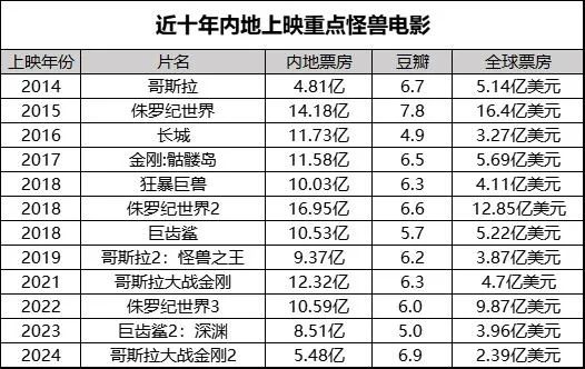 将视角拉回现在,真正将怪兽电影重新带回内地市场的或许还要2006年上映的《金刚》,该片在引进内地后斩获1.02亿元票房,高居该年度票房榜第五名。而此后自2014年的《哥斯拉》起,怪兽电影在内地迎来了真正的爆发期。