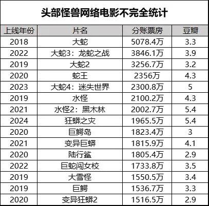 网络电影市场的怪兽电影元年是2018年,这一年,一部横空出世的《大蛇》上线后火爆全网斩获超过5000万分账票房。这部影片的成功引领起了一股怪兽网络电影热,之后几乎每年都能涌现出几部高票房怪兽网络电影。