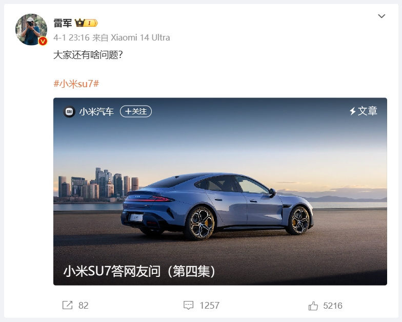 在发布会后,关于小米汽车的消息霸榜热搜,小米汽车也不断发布大定数额的热销战况,外界惊呼:一天卖出了一年的销量。雷军在微博上每日更新,关于小米汽车的答网友问一篇篇发布,连续几日的热度都是小米汽车。