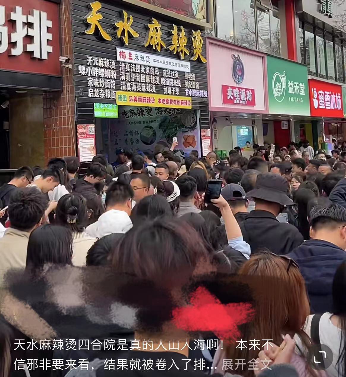一位游客发布视频表示,清明期间,天水麻辣烫店门口真的人山人海,被卷入排队人潮中,根本挤得退都退不出来,排队两个多小时最后才吃上。
