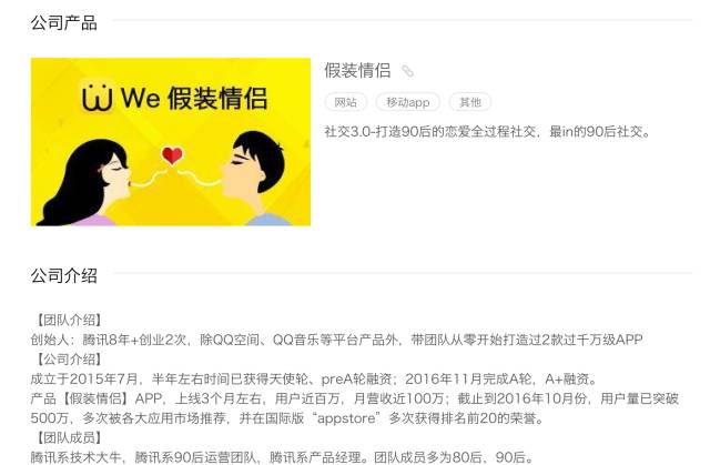 对对科技目前的产品是一款名叫“假装情侣”的应用,号称打造90后的恋爱全过程社交,要“淡化只看脸,不走心的约炮属性”。截止到2016年10月份,据称用户量已突破500万。