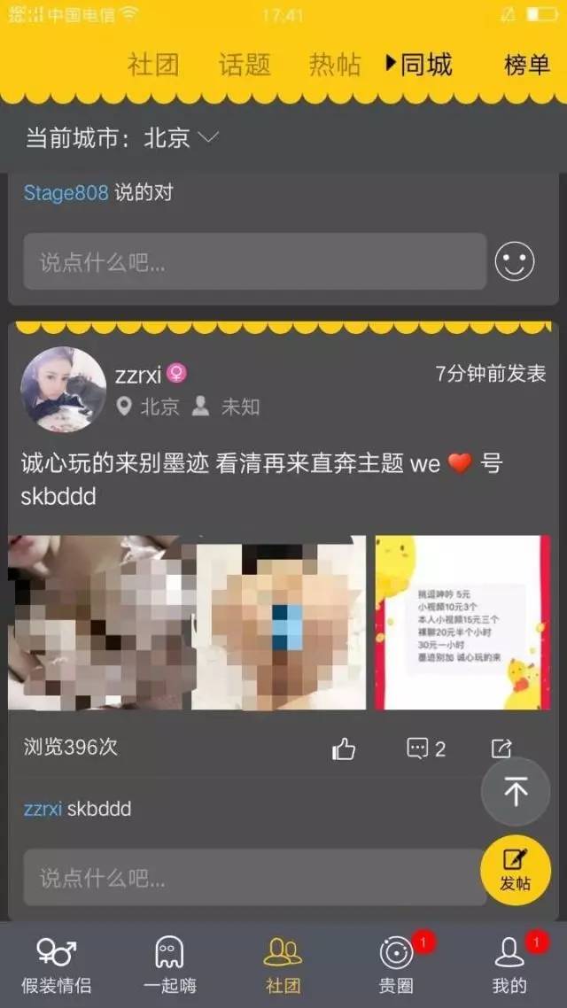 在“贵圈”模块,用户也可以根据不同的类型加入到不同的群体里,里面有“两性圈”,还有按照年龄分类的95后圈,00后圈等。同城交友也是APP主推的内容。而尺度大的女生有不少疑似色情工作者,还把具体的价格直接上传。有匿名用户透露,“不要约炮,小心染病”。