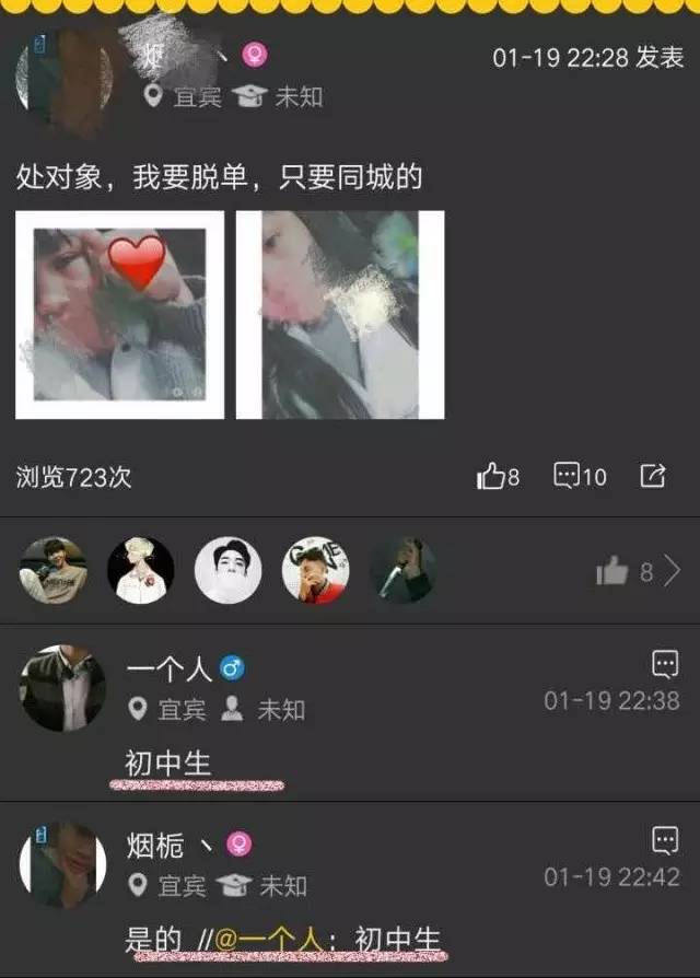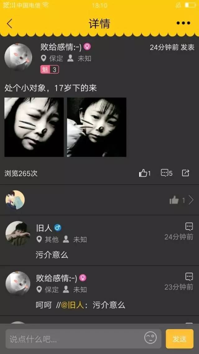 在“我要脱单”的部分,有未成年人发送状态求交友,评论和留言里却大部分是调戏和下流的言语。有的未成年人,也会把自己遮住脸和身体部位的图片直接发送,求勾搭。