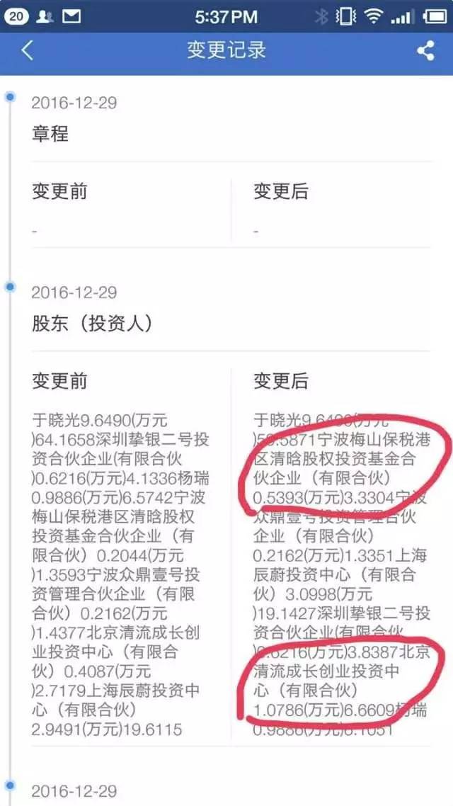 工商资料显示,宁波梅山保税港区清晗股权投资基金合伙企业成立于2016年6月13日,2016年10月24日进行了投资人股权变更。在变更后的股东名单中,拉萨经济技术开发区草根合创资产管理有限公司是第一大股东,占股46.15%,草根合创的法人代表是前中国首富、新希望集团董事长刘永好。第二大股东是宁波清晗高源投资,占股15.38%,清晗高源投资的最大股东是清流资本董事总经理王梦秋,王梦秋是公开的鹿晗粉丝,在“鹿饭圈”中相当有名。