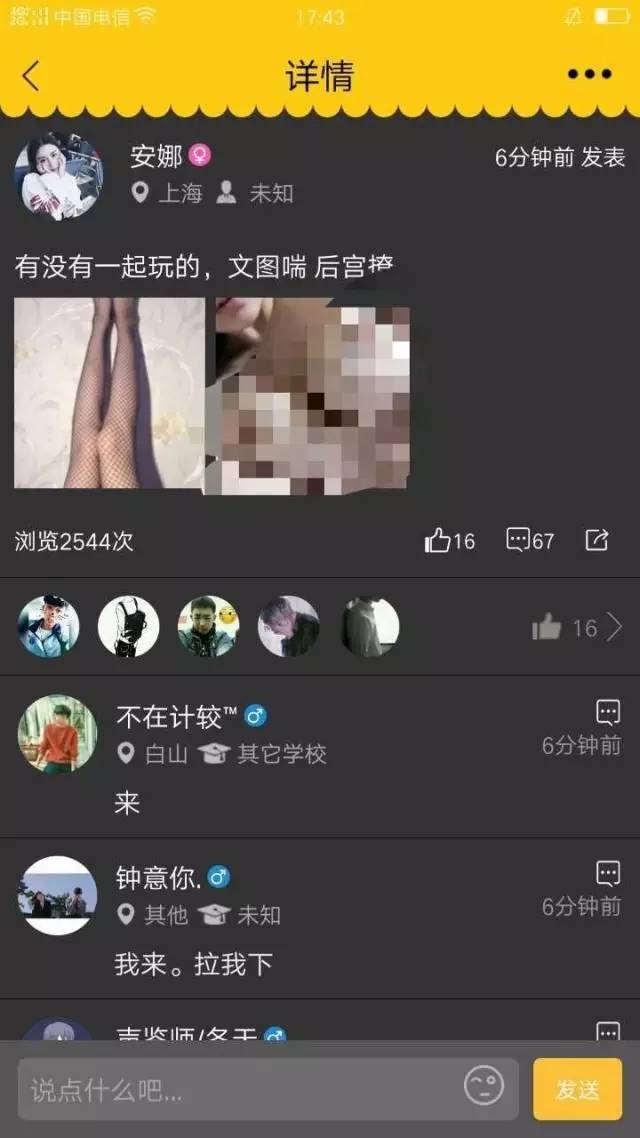 然而,等到进入聊天室之后,就会发现很多人直接进入主题,开始约炮或者文爱。社区部分是最受关注的,“爆照专区”和“啪啪啪那些事”是重灾区。