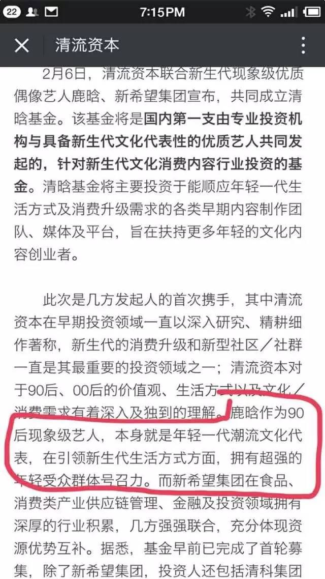 2月6日,投资机构清流资本官方微信宣布,联合新希望集团、新生代现象级偶像艺人鹿晗共同成立清晗基金,专门针对新生代文化消费内容行业投资。不过,三声发现,清晗基金投资的第一个项目,是一个充满露骨信息的社交应用,而且许多用户可能是未成年人。