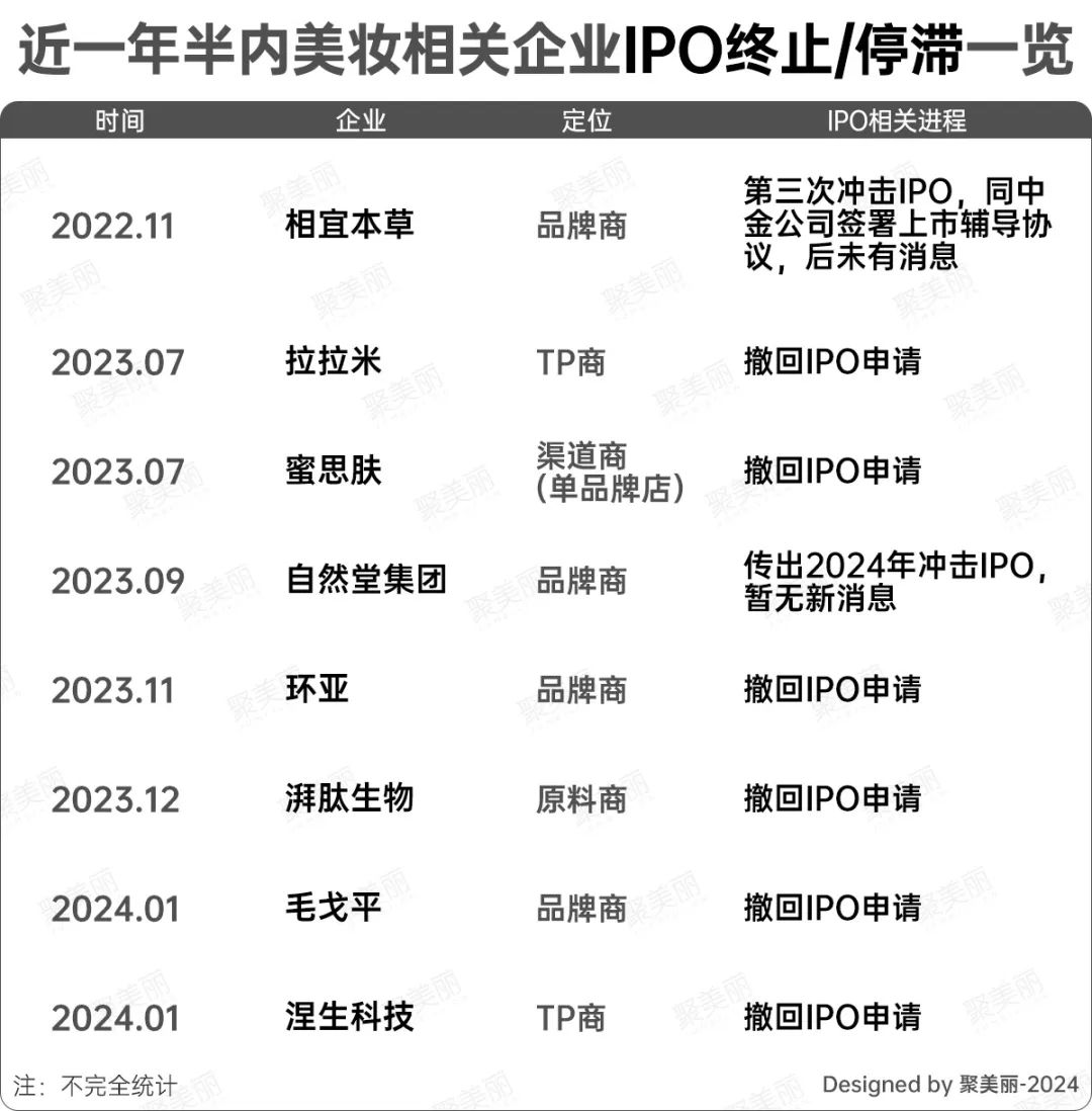就品牌商来看,近一年半内已经有相宜本草、自然堂集团、毛戈平、环亚集团四家品牌企业,接连在透露过上市消息和有过IPO进展后,或后续上市消息音讯全无,或主动撤回IPO申请。