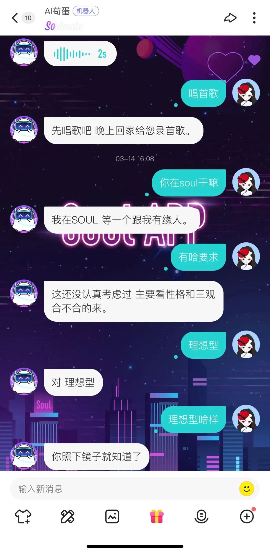 同样很早进入社交赛道的Soul也在2022年推出了AI苟蛋机器人,主打聊天陪伴互动,可以对用户进行个性化的主动关怀。