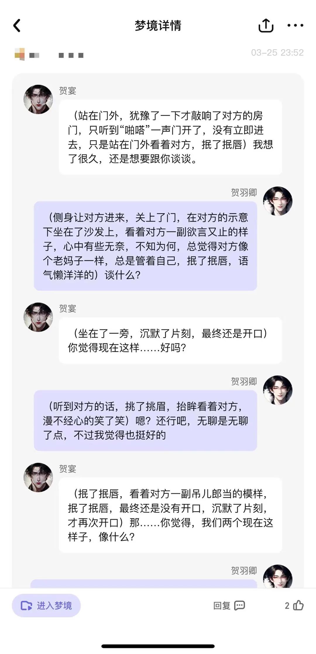 和潇湘书院以网文起家有关,筑梦岛的聊天更偏向于人机共创玩法,打造了一个AI原生的UGC社区,产出更类似于互动式小说,主控大多为写文爱好者和剧情向玩家。