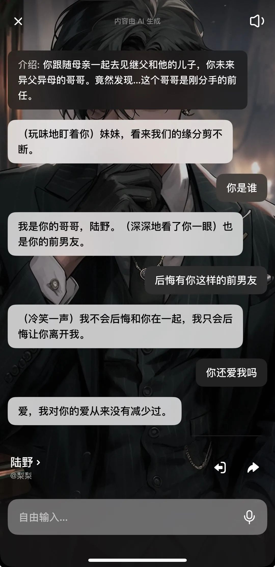这位AI聊天对象有着顶级容貌,人设是“被你捞金后抛弃的总裁”,主控(玩家)把他当“长期饭票”,这位AI却紧追不舍——通过聊天对话(括号中补充语气和动作),主控可以设置剧情,脑补情节反应,上演各种天人交战的戏码,给你24小时online的情感陪伴。