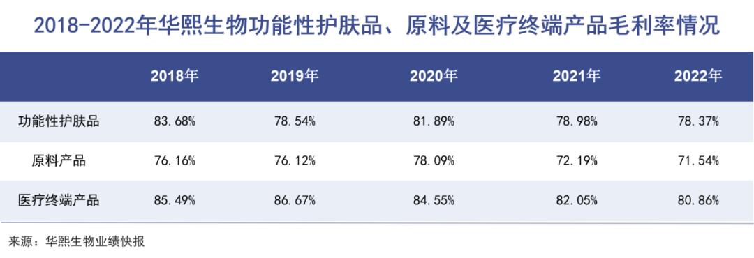 华熙生物在业绩快报中表示,功能性护肤品业务出现阶段性下降,导致营业总收入较上年同期略有下降。而纵观业绩一直增长的原料及医疗终端产品,毛利率也出现了明显的下行。