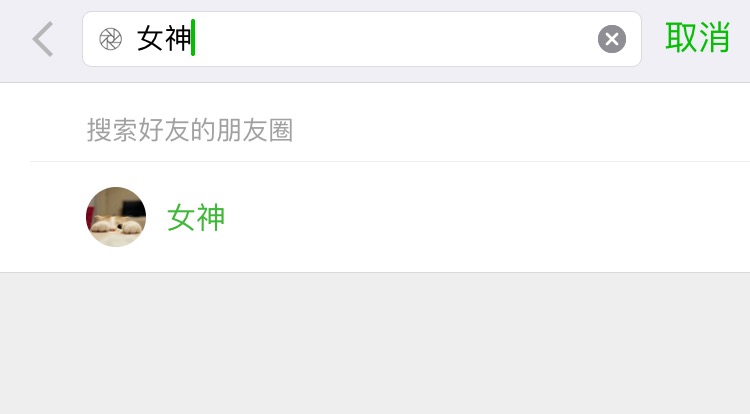 比如我想知道女神最近有没有更新照片,那么只需在聊天界面下拉搜索框,选择「朋友圈」,然后输入女神的微信昵称,静待一会儿,选中女神的名字。
