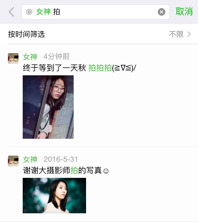 假如你想知道 3 年前,女神三年前长什么样,你还可以点击「按时间筛选」,查看特定时段的朋友圈。