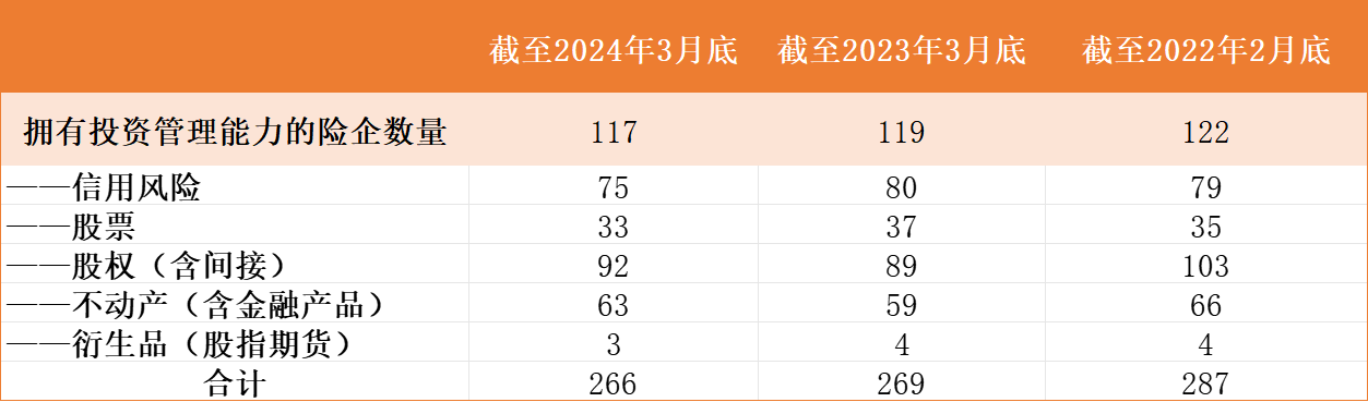 据协会披露,截至2024年3月31日,我国共有117家保险公司具备各类投资管理能力合计266项,其中有97项能力为《关于优化保险机构投资管理能力监管有关事项的通知》印发后保险公司通过自评估和信息披露方式取得。