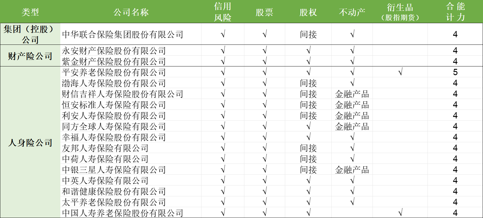 人身险方面洗牌较大,2024年依旧有13家具备4项投资管理能力,但国华人寿、前海人寿、中邮人寿和泰康养老均已退出最新名单,取而代之的分别为利安人寿、中英人寿、和谐健康险和国寿养老。