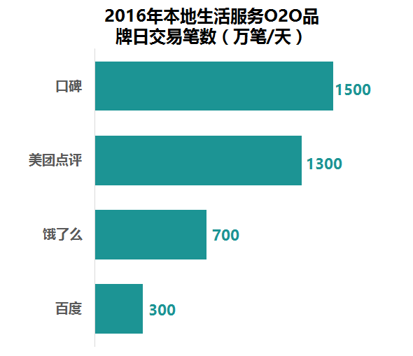 O2O本地生活服务平台格局也发生明显变化。美团点评交易额仍旧排名行业第一;以日交易笔数计算,口碑成为成长速度最快的平台,以1500万笔/天的水平超越美团点评排名第一。在平台方面,美团点评已大约2424.4亿的交易额仍旧排名行业第一,口碑以1731亿排名第二,百度、饿了么排名第三、第四。