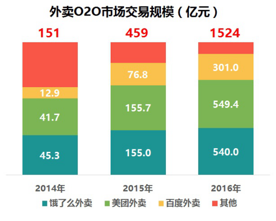 在2016年迎来大发展的是外卖服务。白皮书显示,2016年外卖市场爆炸式发展,交易规模约1524亿,相比2015年的459亿增加了232%。