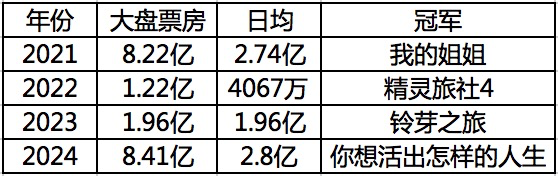 纵观近几年清明档表现,可谓是惨不忍睹,一系列不利因素都巧合的叠加到了清明档中。比如2022年,因疫情原因,国产片集体撤档,导致清明档几乎形成了真空,导致整个市场大盘仅有区区1.22亿。到了2023年,清明假期直接只有一天的时间,导致根本无法吸引新片的加入,因此大盘也就无从谈起。