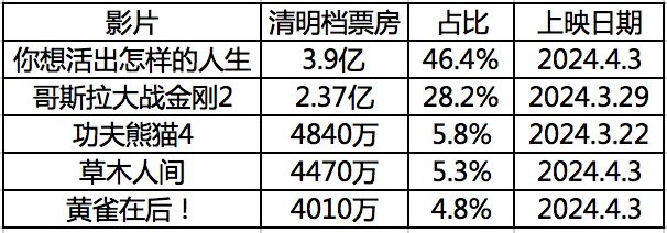 正如前面所说,市场的分化还在不断加剧。宫崎骏新片《你想活出怎样的人生》表现惊人,外加《哥斯拉大战金刚2》的强势输出,一方面支撑起了市场大盘,另一方面也给其他影片造成了压力。而且今年清明档并未有大体量国产片种子登陆,因此拉开了彼此的差距。