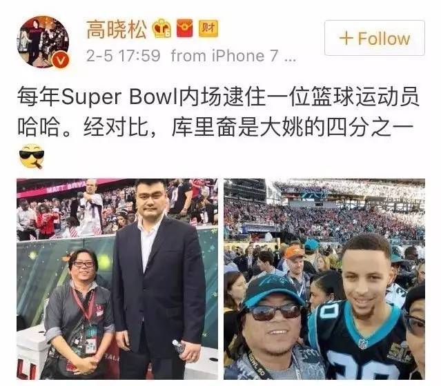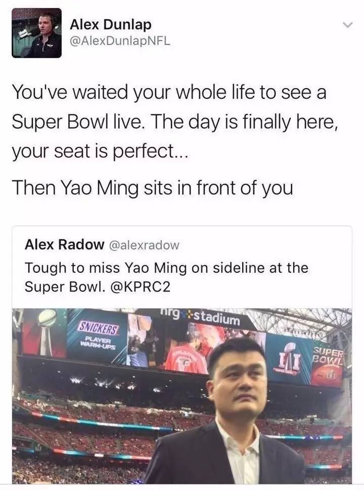 △ “当你用一生来等待这场超级碗比赛,这场比赛真的到来了,你的座位非常棒,比赛也异常精彩,但你的前座是姚明……”