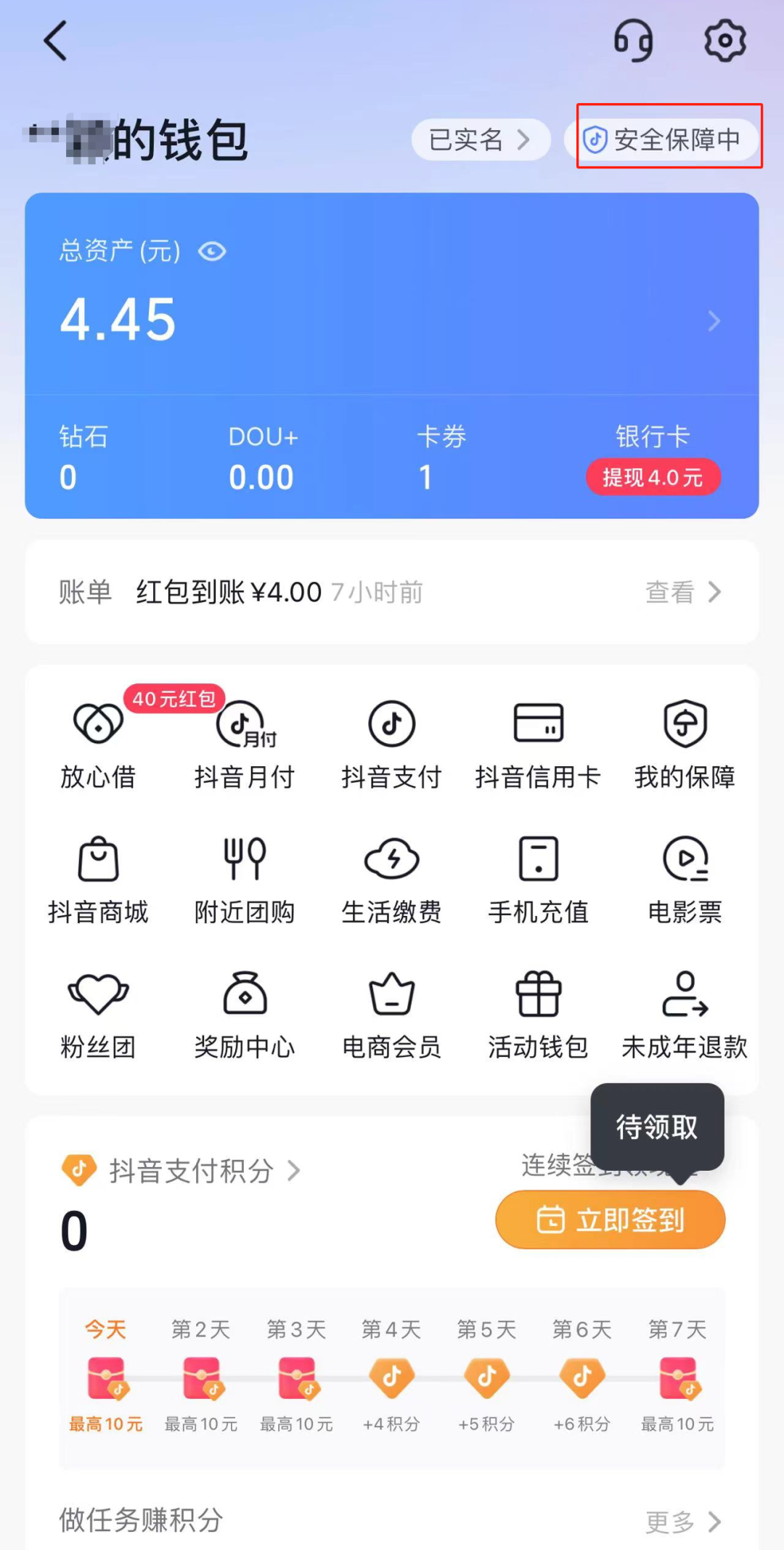 随后,对方使出第二招,让笔者打开抖音,进入“抖音钱包”页面,确认页面上有“百万安全保障中”(发稿前,抖音页面修改为“安全保障中”)字样,然后以此为由,言之凿凿称笔者之前“一定点击订阅过这个免费服务,但现在这个服务要收费了,每个月续费800元”。