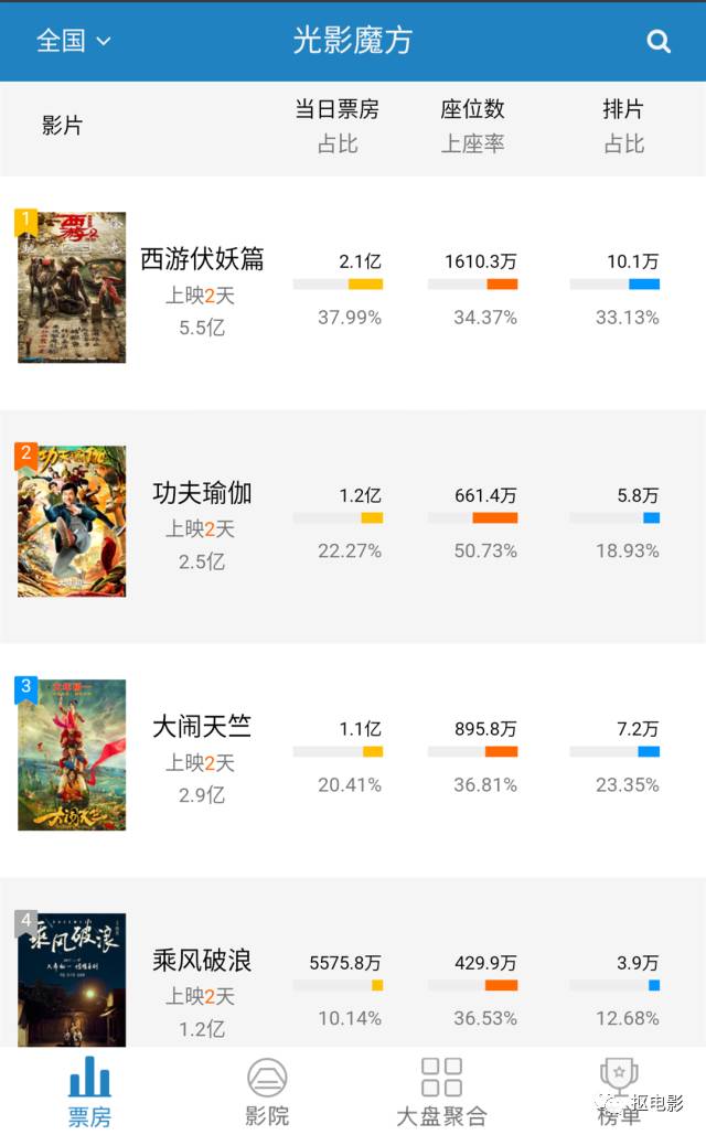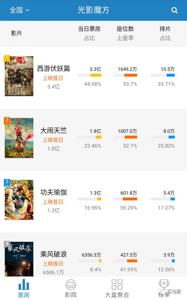 《西游伏妖篇》领跑,紧随其后的是排片第二的《大闹天竺》,之后是《功夫瑜伽》、《乘风破浪》、《熊出没·奇幻空间》、《健忘村》。