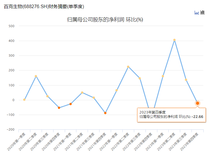 目前,百克生物盈利增速明显放缓。2023年,该公司分季度实现单季度归母净利润分别是1838.1万元、9300.24万元、2.2亿元、1.7亿元,同比变动6.15%、65.32%、58.93%、661.07%,环比变动分别是160.69%、405.97%、136.24%、-22.66%。2024年第一季度,该公司预计归母净利润环比2023年第四季度下滑62%至67%。
