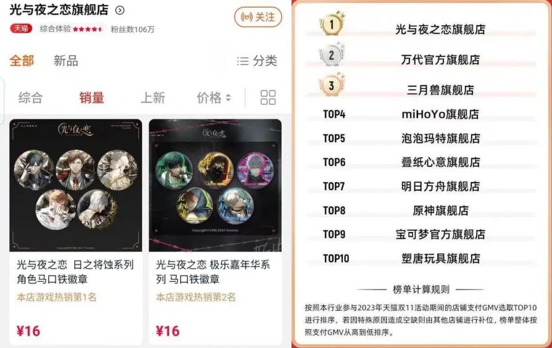据天猫官方公布的23年“双十一”数据,”光与夜之恋旗舰店“位于潮玩榜销售额第一。而店中热销前两名的产品,均为售价16元的徽章,且两款徽章当时的月销量都在30万以上。简单换算,光这两个产品的累计销售额,就接近千万元。