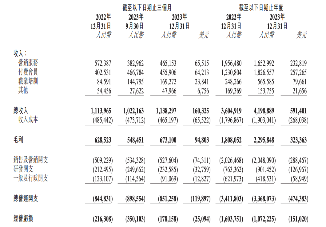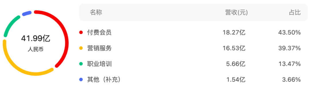在全年的表现上,付费会员和职业培训业务的增长更为显著。2023年全年,付费会员业务收入为18.3亿元人民币,同比增长了48.4%;职业培训业务收入为5.7亿元人民币,同比增长了127.8%。相比之下,营销服务业务在2023年的收入为16.5亿元人民币,同比下降了15.5%;其他业务收入为1.5亿元人民币。