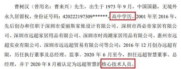 此外,远超智慧研发人员学历水平整体偏低,大部分集中在中专及高中以下。公司目前拥有3名核心技术人员,但他们的学历水平也较低,其中实控人之一的曹树汉作为核心技术人员之一,仅有高中学历。