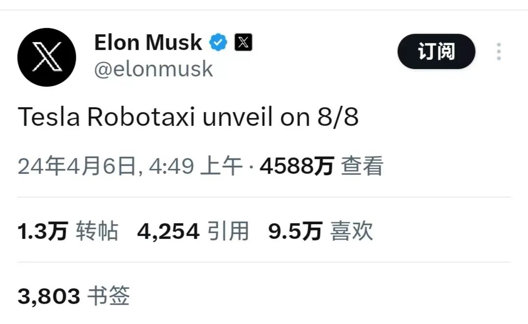 就在辟谣“Model 2”放弃研发后不久,马斯克宣布,将在8月8日发布无人驾驶出租车,即Robotaxi产品。——廉价车只是辟谣没有取消,无人驾驶则直接发布了明确日程,某种程度上也反映着马斯克心中对二者的重要性排名。
