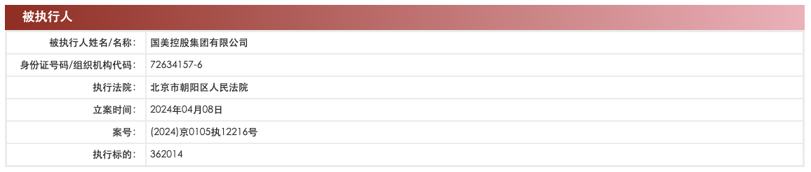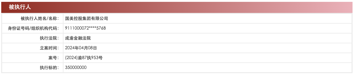 中国执行信息公开网显示,4月8日,国美控股集团有限公司新增2条被执行人信息,执行标的合计3.5亿余元,两案件执行法院分别为成渝金融法院、北京市朝阳区人民法院。