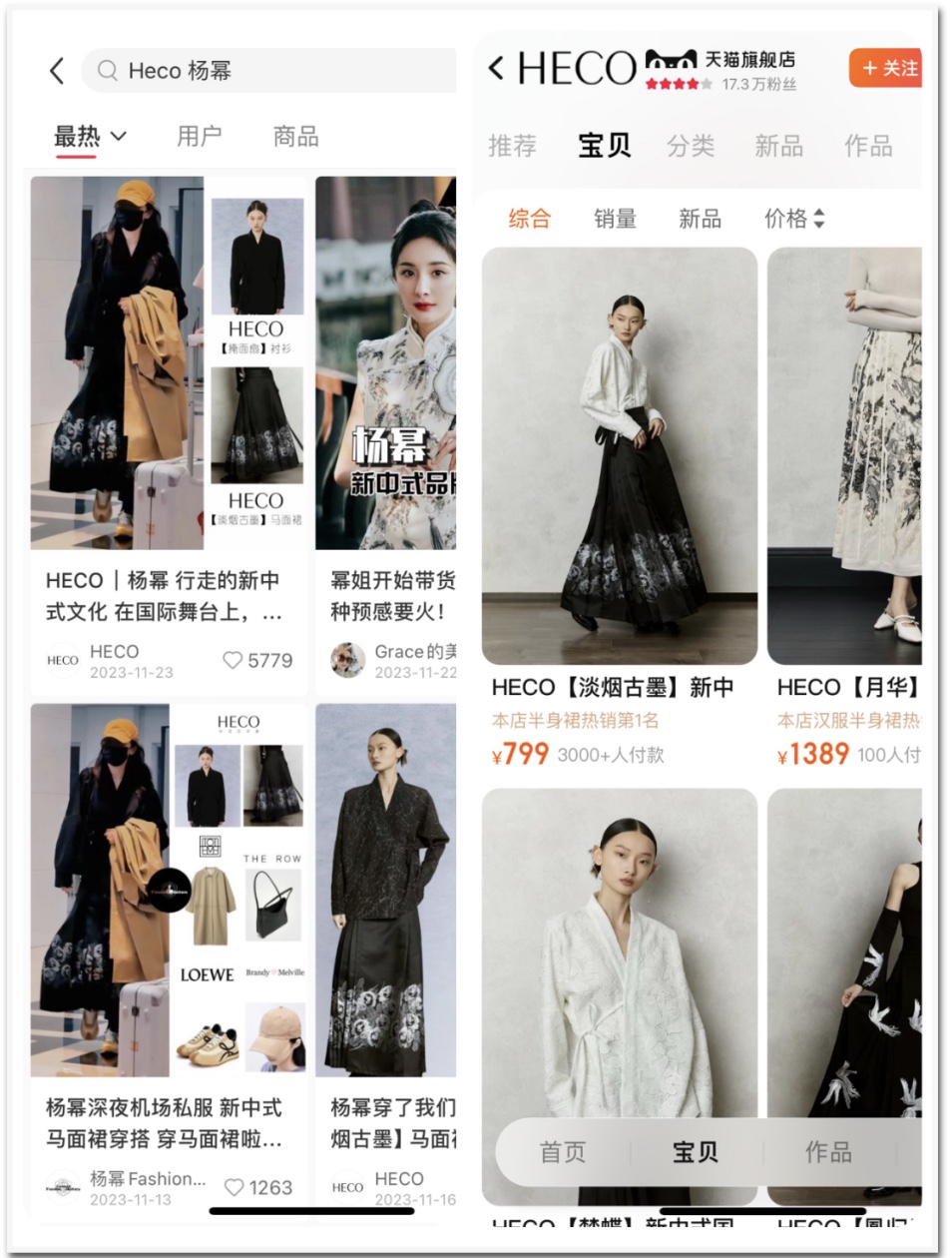 去年11月,杨幂在机场身穿织银玫瑰马面裙,照片一经发出便在社交平台引起了广泛讨论,马面裙品牌HECO也顺势出圈,网友们激情下单明星同款。在HECO官方旗舰店中,这款马面裙销量3000+,是店铺销量最高的一款服饰。此后,HECO开始被许多时尚博主和网红达人分享打卡,迅速吸引了大量粉丝和消费者的注意。