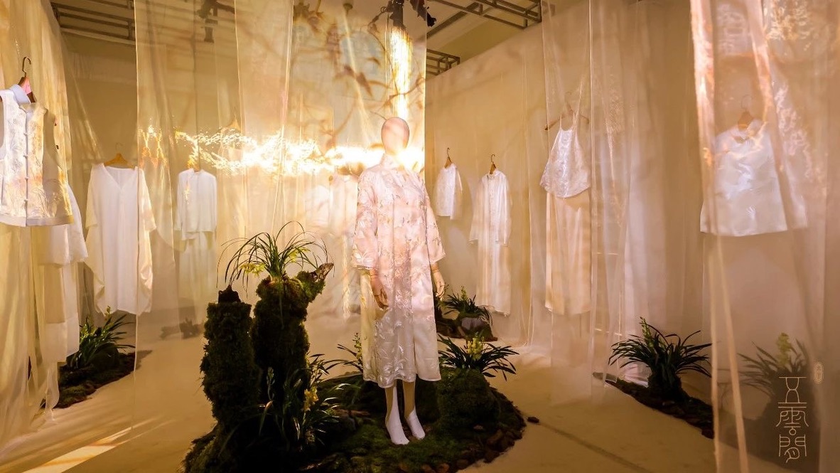 以生活方式品牌“五云间”为例,该品牌在今年3月的上海时装周“东方·新中式”上,通过一场名为“兰· 蝶”的沉浸式秀演,展现了其对“神韵”之美的强调。在活动布景上,五云间巧妙运用幽兰、青苔、纱幔、光影和音乐等元素,营造了一个充满东方美学意境的空间,让参观者沉浸式感受中式美学中对“清、静、慢”生活方式的追求。