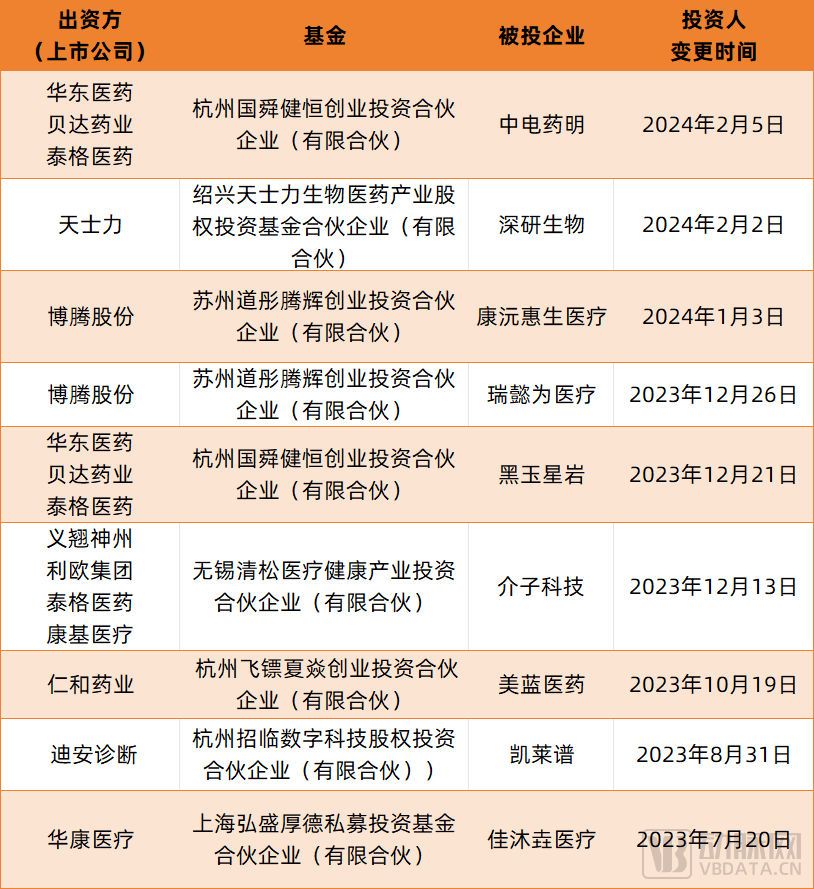 再如,天士力以3.9亿元认购39%份额的“绍兴天士力生物医药股权投资合伙企业(有限合伙)”于2024年2月投资了深研生物。博腾股份参与的“苏州道彤腾辉创业投资合伙企业(有限合伙)”分别于2024年1月、2023年12月投资了康沅惠生医疗、瑞懿为医疗。“医药一哥”恒瑞医药发起设立的“上海盛迪生物医药私募投资基金合伙企业(有限合伙)”于2023年12月投资了洛启生物……