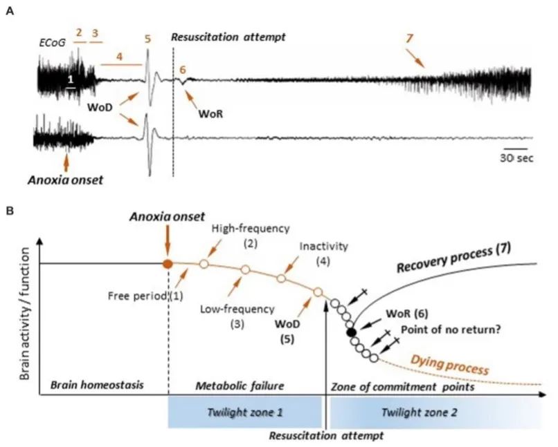 注:小鼠在诱导缺氧和复苏后的脑皮层电图。图A中上方波形可见“死亡脑电波”(WoD)和“复活脑电波”(WoR)。