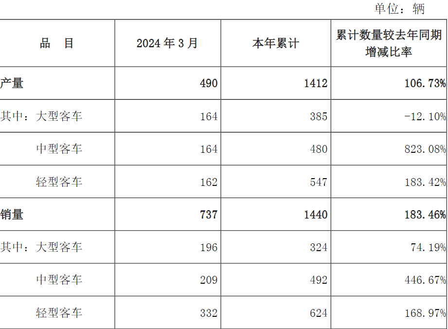 安凯客车4月9日公告,公司第一季度销量合计1440辆,同比上涨183.46%。