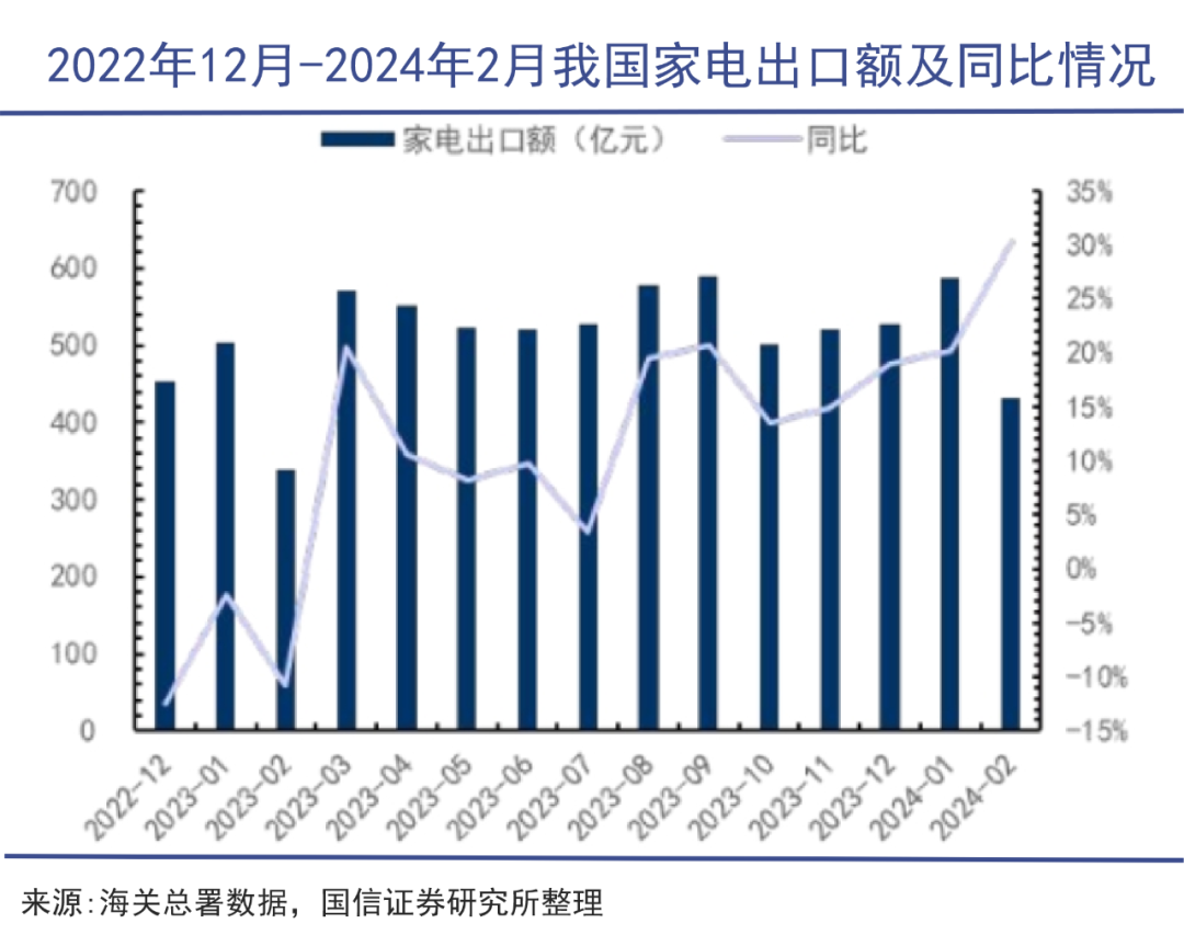 今年家电出口的开局更是好。根据海关总署数据,2024年1月、2月家电整体出口量、出口额(美元)、出口额(人民币)分别增长38.6、20.8、24.3%,量额均实现快速增长。