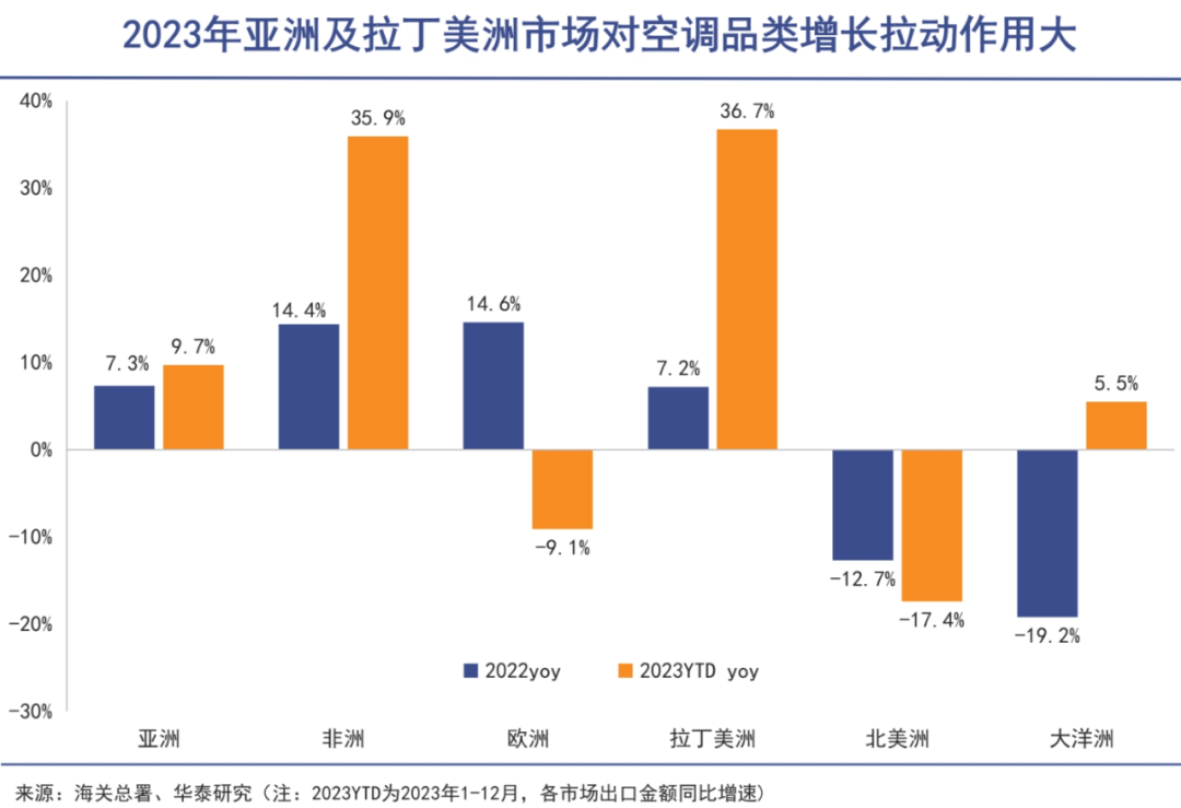 以空调为例,2023年我国空调产品出口额同比增长7.7%,主要增长来自于亚洲及拉丁美洲市场,其中,亚洲市场金额占我国空调出口额的50.5%,同比增长9.7%,而拉丁美洲市场成为第三大出口目的地,同比增长36.7%。