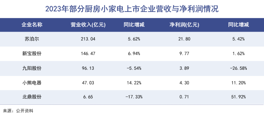 凭借厨房小家电起家的九阳表现不佳,2023年实现营业收入96.13亿元,同比下降5.54%,归属于上市公司股东的净利润3.89亿元,同比下降26.58%。