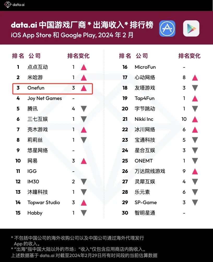 该游戏背后的厂商是北京元趣娱乐(OneFun)。得益于《Last War:Survival》的成功,元趣娱乐在今年2月份一举超过腾讯、三七互娱等头部大厂,冲上了国内厂商出海收入榜单的TOP3(榜单来源:data.ai)。